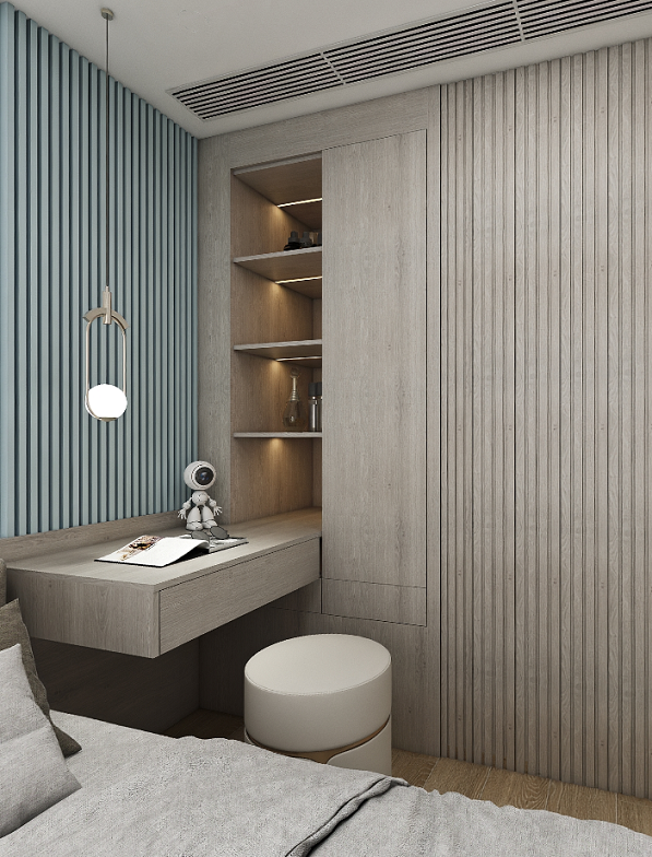 在并不宽敞的空间内,通过定制的家具满足功能及储物需求,将衣柜、书桌及书柜做了一体化结合设计,即便是素色空间,却能让人感受到温暖而舒适的惬意生活。