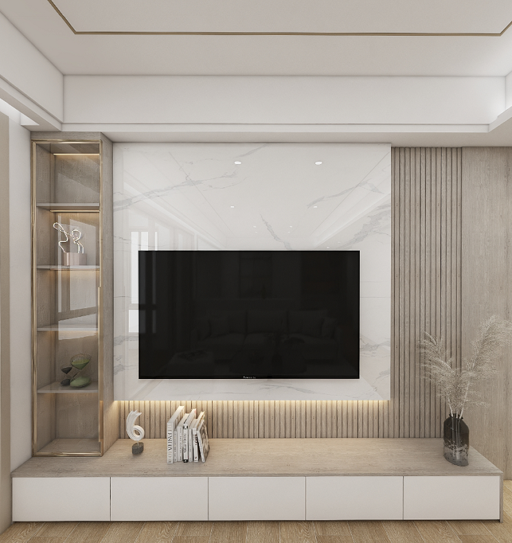 欧兰博定制L字形电视柜,底部电视柜是兔宝宝柔光暖白色作为柜门。柜体统一都是兔宝宝云灰沙比利色,玻璃柜门虚实结合搭配,层次感十足。